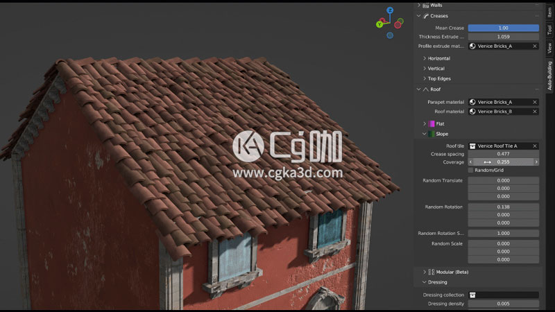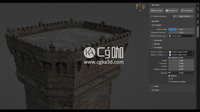 该原理也适用于边缘。例如,使用“折痕”属性,您可以决定沿着建筑物的顶部散布特定对象以创建重复的细节。或者挤压它以添加壁架。
